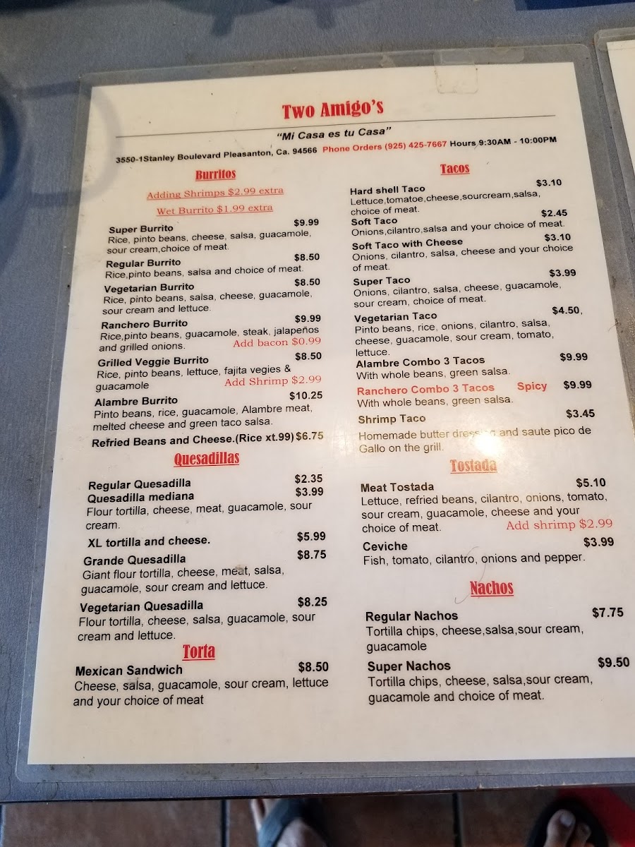 Welcome to Two Amigos, a fantastic taqueria nestled in Pleasanton, California. Here, you'll find a vibrant menu that captures the heart of Mexican cuisine, and the reviews speak volumes. Guests rave about the Chicken Enchiladas and the flavorful Shrimp Burrito, paired perfectly with their delightful Mango Margaritas. The ambiance is inviting, featuring a lovely outdoor patio, making it an excellent choice for family dining.